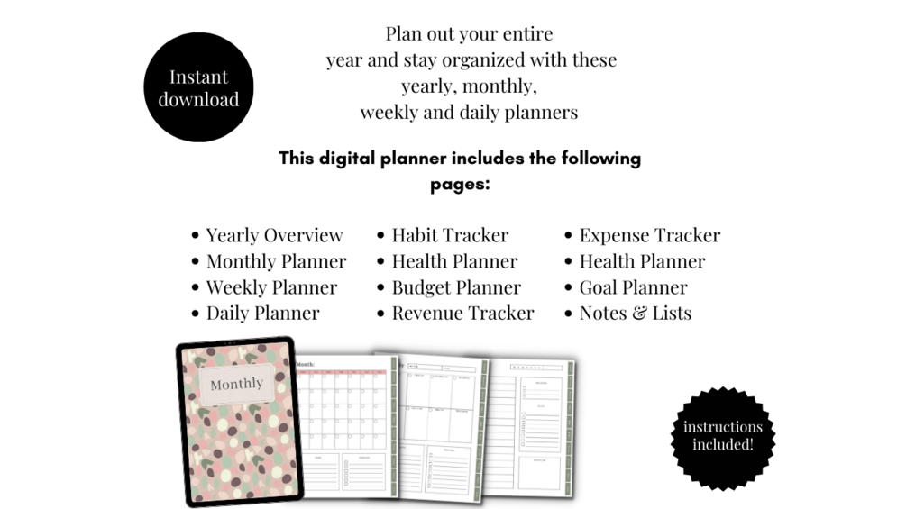 This digital planner includes the following pages: