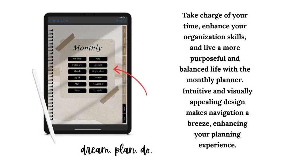 A digital planner is just like the traditional paper plannerss, with the difference that instead of being in paper form, you import a PDF file into a note-taking app and use it on your iPad or tablet. It's a hyperlinked PDF, when you tap on the tabs, it will automatically take you to the page you want.